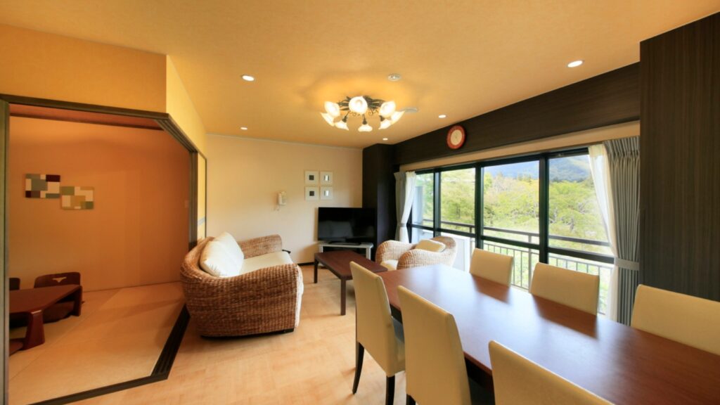 強羅温泉 スイートヴィラ箱根強羅は広々したリビングルームから箱根の大文字焼で有名な明星ヶ岳の眺望も楽しむことができます!和洋折衷タイプA101は猫と一緒に宿泊可!
