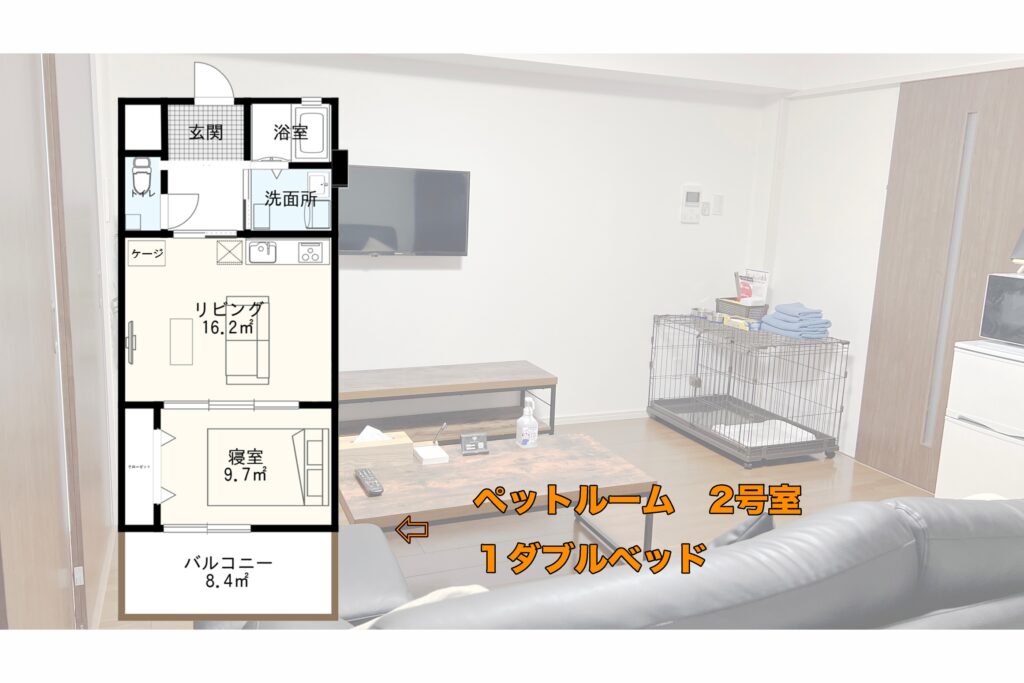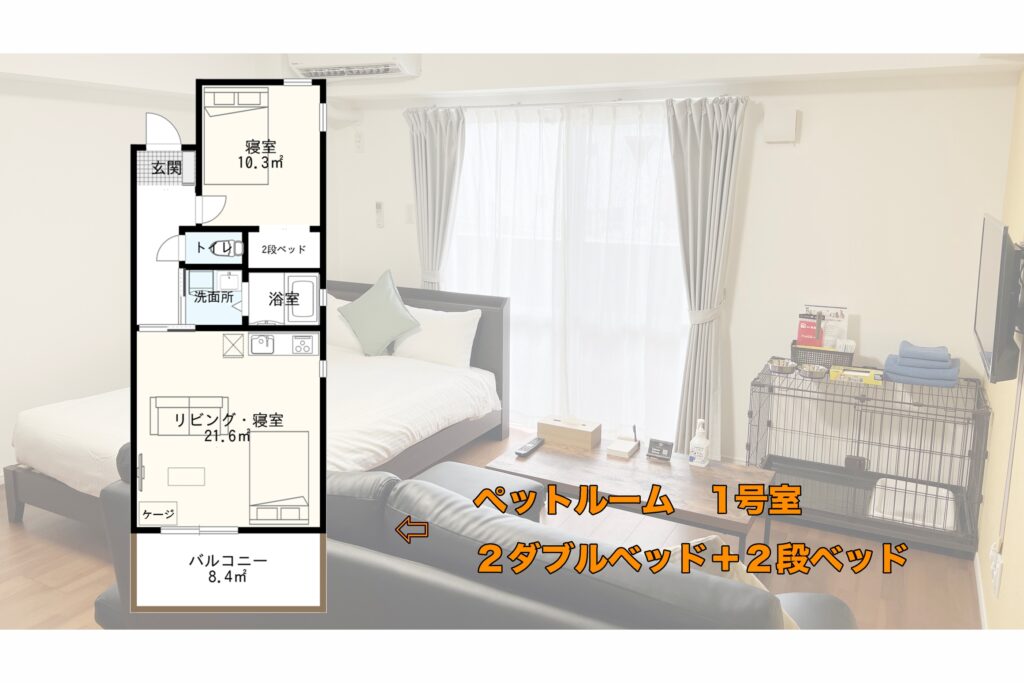 | ペット宿泊について | 宿泊可能なペット:猫、犬(小型〜大型犬) お部屋は2タイプ(大人最大2名様のお部屋、大人最大4名様+お子様2名様)、ペットは最大2匹まで一緒に宿泊可能 |